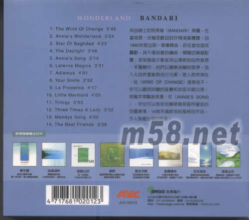 仙境(m58.net) 仙境 Wonderland 空靈飄邈的音樂世界 聆聽一塵不染的瑞士音符 美國音樂雜誌專欄作家〝約翰‧瓊斯〞在94年終音樂評論中寫道:「New Age為現代人創造了一片美麗新世界,引領人們找回生命最原始的感動﹍」。繼之而來「水瓶座時代」已然展開,對於浩瀚太虛的神秘能量,人類不再只是讚嘆或被動地當那是遙不可及的奢侈,反而積極企圖與之連結,更追本溯源地求能合而為一;而音樂自然是和大地深處甚至數億光年外的未知能量產生共鳴的捷徑,於是「新世紀音樂」彷彿一扇眺望宇宙盡頭的窗,進而探索心靈,開發潛能意識,成了世代交替下的新趨勢。 出自新世紀音樂大師〝杰瑞‧金史密斯(Jerry Goldsmith)〞之手,由來自瑞士的抒情演奏樂團「班得瑞(Bandari)」擔綱演奏的14首新世紀音樂創作,收錄在「仙境」這張經典專輯里;全片從頭到尾聽來覺得十分舒適,強調一種輕柔的絕對性,沒有艱澀難懂的曲風,也沒有生硬的個人風格,完整忠實呈現美侖美奐的仙境風光。專輯絕佳的音響性,以及分軌處理的高解析度,定位出深遠的音場效果,是近年來臺灣難得一見的新世紀音樂珍藏品。 來自瑞士的班得瑞(BANDARI)樂團,在當地是一支極受歡迎的抒情演奏團體,自1990年推出第一張專輯后,即在當地造成轟動,其不落俗套的編曲,精簡的樂器配置,使每首曲子都呈現出清新的自然氣息。本專輯中,他們以簡單流暢的旋律,加入大自然意象與流行元素,使人悠然神往。從〈WIND OF CHANGE〉這首曲子,你可以聽到呼嘯的風聲和排笛交錯出現,感覺非常飄邈浪漫;在〈ANNIE’S SONG〉,你也可以感受到鋼琴與長笛所營造的空靈意境,14首充滿新世紀風格的作品,予人身處仙境的感受!