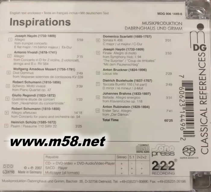 極度 Hi Fi 試碟王 Classical References 靈感 SACD(m58.net) 名古典發(fā)燒品牌MDG輯錄多段得獎(jiǎng)發(fā)燒錄音,多位名家分別演繹,數(shù)人頭式的合唱,鏗鏘的琴韻,靚絕的弦樂及通透的吹號(hào)等,如臨現(xiàn)場(chǎng)的通透感是試機(jī)必然選擇。 MDG經(jīng)典合集,節(jié)選作曲家作品中最優(yōu)美的段落,包括:海頓小號(hào)協(xié)奏曲、韋瓦爾弟:弦樂協(xié)秦曲、莫扎特:懺悔者的莊嚴(yán)晚禱、舒曼:鋼琴四重奏,許茨:感恩贊,斯卡拉蒂、勃拉姆斯鋼琴作品等SACD,德國壓碟!