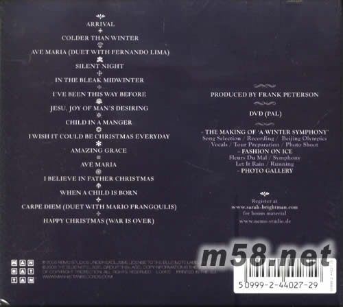 冬之歌A Winter Symphony(CD+DVD精裝歐版)(m58.net) 11月,莎拉發行今年的第二張專輯《真愛永恆 冬之歌》,莎拉將自己高超的歌唱技巧和原創力投入這些膾炙人口的經典歌曲之中,包括了〈Silent Night〉、約翰藍儂和小野洋子合寫的〈Happy Christmas (War Is Over)〉,以及尼爾戴蒙的經典歌曲〈I`ve Been This Way Before〉、〈In The Bleak Midwinter〉;阿巴樂團難得的演奏曲〈Arrival〉:莎拉特別請人填詞,讓此曲首度成為歌曲;另外,這張新片中也有兩首合唱歌曲:一首是邀請男高音利馬合唱〈Ave Maria〉,另一首則是與希臘男高音馬利歐(Mario Frangoulis)合唱的〈Carpe Diem〉;不僅如此,莎拉更與倫敦交響樂團和皇家交響樂團、以及46位詩班歌手組成的合唱團合作,展開華麗的女高音演唱。 《真愛永恆 冬之歌》發行的同時,莎拉也展開全球巡迴演出,這將是她四年來首度全球巡迴演出,首場演出在墨西哥的蒙特雷市登場。她也會到美國舉行18場演唱會、在加拿大舉行十場、墨西哥舉行四場。這些演唱會同樣承襲她過去盛大華麗的舞臺製作風格,各地觀眾將會看到嶄新、教人屏息的新科技,以及各種虛擬和360度的舞臺設計,讓前來欣賞的樂迷們看到前所未有的大場面。這次莎拉巡迴演唱會中的舞臺布置所採用的新式科技,非常精細復雜,而且充滿特效,將會呈現出仙境、天國般的感覺:讓人同時在舞臺上看到華麗的舞廳與童話故事裡的花園結合在一起,也看到巨型的水族箱就這樣出現在舞臺上,在莎拉美妙的歌聲之餘,也滿足了觀眾的視覺享受。
