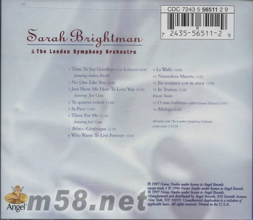 在莎拉?布萊曼(Sarah Brightman)的每張專輯中,她無與倫比的兼具古典與流行的音樂都能得到驚人的闡釋。她是當代最有傳奇色彩的舞臺劇名伶,由她所詮釋的韋伯的代表作《歌劇魅影》、《安魂曲》等早已成為音樂劇史上的里程碑,創造了一個又一個神話。她與卡雷拉斯合唱的巴塞羅納奧運會的主題歌《Friend For Life》,與Andrea Bocelli合唱的《To Say Goodbye》,都已成為音樂史上的經典。在她的演唱中,完美地融合了古典與流行的元素,使她的音樂具有無窮的魅力。