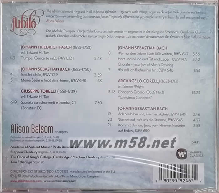 Ø 「歡慶」專輯收錄了巴哈與同時期作曲家法許、柯瑞里、托瑞里為節日喜慶創作的音樂,也是小號家艾莉森‧鮑爾珊再度在錄音室回到巴洛克時期的曲目。此張專輯是特別為今年的圣誕節所錄製,以巴洛克時華麗的節慶音樂陪伴樂迷歡度佳節!
