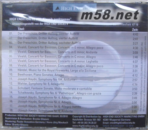 皇牌精選,發(fā)燒友不會錯過的德國高級音響協(xié)會示范天碟,第十四集名為Classic Pin Pointed (玻璃球),專集以一個玻璃球反映出對岸的美景,全碟67分鐘,由15首精彩古典音樂和三首歌唱組成。2010年為Denon, Nippon Columbia 100週年紀念,為慶祝這重要日子,德國高級音響協(xié)會搜羅Denon, Nippon Columbia公司在90年代出色單點收音作品,這些錄音正示范出何為單點錄音,帶來原音 (acoustic) 樂感。