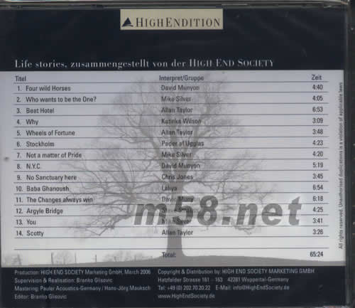 德國高級音響協會High-End Society專門搜集Chesky、Opus3、Glitterhouse、Triloke Records、lrak等歐洲發燒品牌的著名錄音,編輯成測試CD作為每年在法蘭克福舉行的展覽會之用,這些錄音內容豐富,音效上乘。喜見第9輯收錄的曲目全屬可圈可點的示范級作品:14首極品電平統一,調節音量,驚人的數碼3D感在音場中即將營造出龐大飽滿的量感和質感,充滿整個空間畫出立體舞臺,我坐在皇帝位上驚嘆兩只喇叭在渾響中自然消失,立體透視出歌者的位置、咀形、喉音振動聲和齒音水聲,男聲質感從容厚度各類功架,女聲深情專注韻味獨領風騷,各種獨奏樂器美感與質感共存,音效之佳令人神魂顛倒,錄音不但主題突出,同時注重整體平衡,主唱與伴奏在即與中交融,構成細膩鮮明的層次感和提供逼真樂器聲的分隔比例,妙不可言。