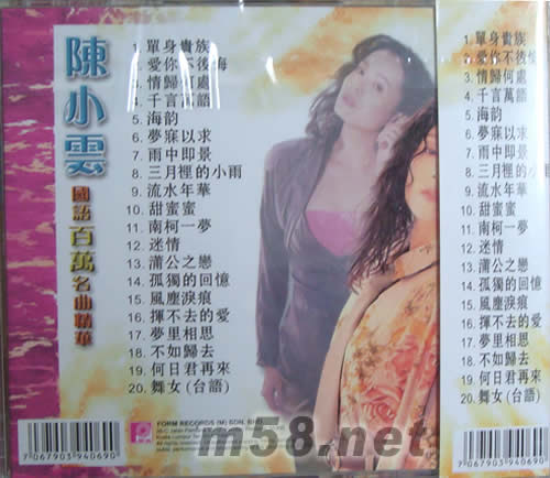 單身貴族 2 愛人不後悔 3 情歸何處 4 千言萬語 5 海韻 6 夢寐以求 7 雨中即景 8 三月里的小雨 9 流水年華 10 甜蜜蜜 11 南柯一夢 12 迷情 13 蒲公之戀 14 孤獨的回憶 15 風塵淚痕 16 揮不去的愛 17 夢里相思 18 不如歸去 19 何日君再來 20 舞女(臺語)