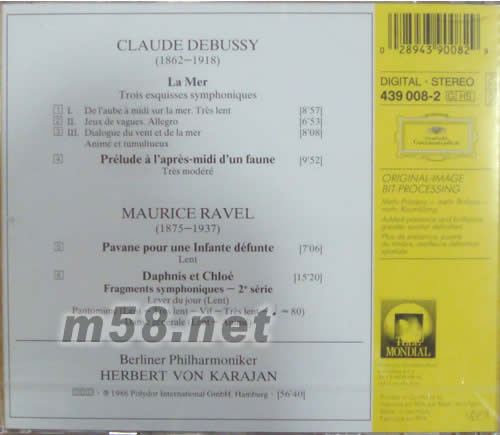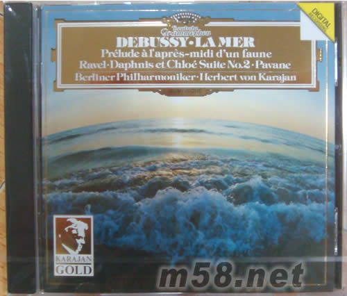 DEBUSSY:LA MER 德彪西:大海 金裝卡拉揚系列(m58.net) 交響音畫《大海》(Debussy: La Mer),作于1905年3月,初演于1905年10月。本曲為德彪西最大的一部交響音樂作品,由三個不同內容的樂章組成,但每個樂章之間又有內在的聯系,集中起來構成一部完整的作品。它表現了“大海”的景色及其富有動態的性格,并通過整個樂隊的不同音區,極為強烈地表現出“大海”中各種畫面的色彩。樂曲在時間和空間上給人以完整的“海”的印象和對“海”的幻想。新穎的和聲、短小的旋律、豐富的音色、自由的發展,這些印象派的手法,都生動地刻畫出了一幅幅大海的生動畫面。 全曲分為三大部分:一、《海上的黎明到中午》這一部分順序描寫了大海的潮水聲;夜幕緩慢地揭開,一絲光亮映照在海面上;一輪紅日漸漸升起,天空由紫色變為了青色,逐漸地增加了光輝,一幅開闊的大海黎明景色被生動地描繪出來。二、《波浪的游戲》音樂生動地描繪了白色的浪花拍擊海岸時的情景。導入部描寫了可愛的小波浪來回動蕩的音響。在音樂的繼續發展中,英國管奏出可愛的第一個主要動機,給人以幽閑的感覺。三、《風和海的對話》這一部分開始時,定音鼓的震音刻畫出遠方激動、飄浮著的雷聲。之后,音樂描寫了海風吹到海面,引起陣陣騷亂的潮聲,猶如風和海的對話。這部作品不僅描繪出了一幅引人入勝的大海波瀾壯闊的景象,同時也表現出作者對大自然景物的歌頌和贊美。