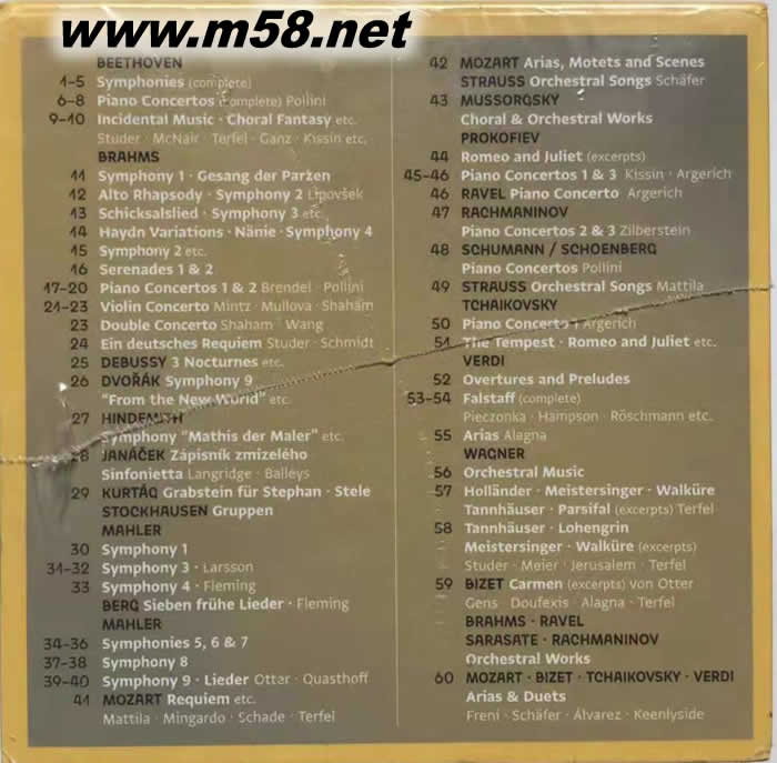DISK 1 CD 編號 曲名 1. 貝多芬:C大調第一號交響曲,作品21 2. 貝多芬:降E大調第三號交響曲《英雄》,作品55 DISK 2 CD 編號 曲名 1. 貝多芬:D大調第二號交響曲,作品36 2. 貝多芬:降B大調第四號交響曲,作品60 DISK 3 CD 編號 曲名 1. 貝多芬:C小調第五號交響曲《命運》,作品67 2. 貝多芬:F大調第六號交響曲《田園》,作品68 DISK 4 CD 編號 曲名 1. 貝多芬:A大調第七號交響曲,作品92 2. 貝多芬:F大調第八號交響曲,作品93 DISK 5 CD 編號 曲名 1. 貝多芬:D小調第九號交響曲《合唱》,作品125 2. 瑪提拉,女高音/烏爾瑪娜,次女高音/湯瑪斯‧莫瑟,男高音/夸斯托夫,低男中音/艾瑞克森室內合唱團/瑞典廣播合唱團 DISK 6 CD 編號 曲名 1. 貝多芬:C大調第一號鋼琴協奏曲,作品15 2. 貝多芬:降B大調第二號鋼琴協奏曲,作品19 3. 波里尼,鋼琴 DISK 7 CD 編號 曲名 1. 貝多芬:C小調第三號鋼琴協奏曲,作品37 2. 貝多芬:G大調第四號鋼琴協奏曲,作品58 3. 波里尼,鋼琴 DISK 8 CD 編號 曲名 1. 貝多芬:降E大調第五號鋼琴協奏曲《皇帝》,作品73 2. 波里尼,鋼琴 DISK 9 CD 編號 曲名 1. 貝多芬:戲劇配樂《艾格蒙》,作品84 2. 貝多芬:為女高音與管弦樂團而寫的場景與詠嘆調《啊,負心的人》,作品65 3. 史都德,女高音 4. 貝多芬:C大調《雷奧諾拉》序曲第三號,作品72a 5. 貝多芬:為鋼琴、合唱團與管弦樂團所寫的《合唱幻想曲》,作品80 6. 紀新,鋼琴/史都德,女高音/克麗斯提娜‧克列門茲,女高音/卡帕索,次女高音/阿勒爾,男高音/大島博,男高音/莫爾斯伯格,男低音/柏林美國佔領區廣播電臺合唱團 DISK 10 CD 編號 曲名 1. 貝多芬:戲劇配樂《獻給劇院》,作品124 2. 貝多芬:戲劇配樂《雷奧諾拉‧普羅哈斯卡》,WoO 96 3. 麥克芮爾,女高音/朗格拉梅特,豎琴/卡洛琳‧艾希霍恩,旁白/雷克特,玻璃琴/柏林廣播合唱團 DISK 11 CD 編號 曲名 1. 布拉姆斯:C小調第一號交響曲,作品68 2. 布拉姆斯:為合唱團與管弦樂團而寫的《命運之歌》,作品89 3. 柏林廣播合唱團 DISK 12 CD 編號 曲名 1. 布拉姆斯:女中音狂想曲,作品53 2. 利波夫雪克,女低音 3. 恩斯特‧森夫室內合唱團 4. 布拉姆斯:D大調第二號交響曲,作品73 DISK 13 CD 編號 曲名 1. 布拉姆斯:《悲劇》序曲,作品81 2. 布拉姆斯:為合唱團與管弦樂團而寫的《天命之歌》,作品54 3. 恩斯特‧森夫室內合唱團 4. 布拉姆斯:F大調第三號交響曲,作品90 DISK 14 CD 編號 曲名 1. 布拉姆斯:海頓主題變奏,作品56a 2. 布拉姆斯:為合唱團、管弦樂團與即興豎琴而寫的《輓歌》,作品82 3. 柏林廣播合唱團 4. 布拉姆斯:E小調第四號交響曲,作品98 DISK 15 CD 編號 曲名 1. 布拉姆斯:D大調第二號交響曲,作品73 2. 布拉姆斯:《大學慶典》序曲,作品80 DISK 16 CD 編號 曲名 1. 布拉姆斯:D大調第一號為管弦樂團而寫的小夜曲,作品11 2. 布拉姆斯:A大調第二號為管弦樂團而寫的小夜曲,作品16 DISK 17 CD 編號 曲名 1. 布拉姆斯:D小調第一號鋼琴協奏曲,作品15 2. 布蘭德爾,鋼琴 DISK 18 CD 編號 曲名 1. 布拉姆斯:降B大調第二號鋼琴協奏曲,作品83 2. 布蘭德爾,鋼琴 DISK 19 CD 編號 曲名 1. 布拉姆斯:D小調第一號鋼琴協奏曲,作品15 2. 波里尼,鋼琴 DISK 20 CD 編號 曲名 1. 布拉姆斯:降B大調第二號鋼琴協奏曲,作品83 2. 波里尼,鋼琴 DISK 21 CD 編號 曲名 1. 布拉姆斯:D大調小提琴協奏曲,作品77 2. 明茲,小提琴 3. 布拉姆斯:《大學慶典》序曲,作品80 DISK 22 CD 編號 曲名 1. 布拉姆斯:D大調小提琴協奏曲,作品77 2. 穆洛娃,小提琴 DISK 23 CD 編號 曲名 1. 布拉姆斯:D大調小提琴協奏曲,作品77 2. 夏漢,小提琴 3. 布拉姆斯:A小調為小提琴、大提琴與管弦樂團而寫的復協奏曲,作品102 4. 夏漢,小提琴 5. 王健,大提琴 DISK 24 CD 編號 曲名 1. 布拉姆斯:德意志安魂曲,作品45 2. 史都德,女高音/安德列亞斯‧施密特,男中音/瑞典廣播合唱團/艾瑞克森室內合唱團 DISK 25 CD 編號 曲名 1. 德布西:為管弦樂團而寫的《牧神的午后》前奏曲 2. 帕胡德,長笛 3. 德布西:為女聲合唱與管弦樂團而寫的《夜曲》 4. 柏林廣播合唱團 5. 德布西:歌劇《佩利亞與梅麗桑》音樂會組曲 DISK 26 CD 編號 曲名 1. 德弗札克:音樂會序曲《奧泰羅》,作品93 2. 德弗札克:E小調第九號交響曲《新世界》,作品95 DISK 27 CD 編號 曲名 1. 亨德密特:《畫家馬蒂斯》交響組曲 2. 亨德密特:《最尊貴的顯圣》芭蕾組曲 3. 亨德密特:韋伯主題交響變形 DISK 28 CD 編號 曲名 1. 楊納杰克:失蹤者的日記 2. 蘭格里吉,男高音/巴蕾,次女高音/柏林美國佔領區廣播電臺室內合唱團 3. 楊納杰克:小交響曲 DISK 29 CD 編號 曲名 1. 庫爾塔格:為吉他與樂器所寫的《史蒂芬的墓碑》,作品15c 2. 史托克豪森:為三個管弦樂團所寫的《群》 3. 庫爾塔格:為管弦樂團所寫的《碑》,作品33 DISK 30 CD 編號 曲名 1. 馬勒:D大調第一號交響曲《巨人》 DISK 31 CD 編號 曲名 1. 馬勒:D小調第三號交響曲 2. 安娜‧拉森,女低音/倫敦交響樂團合唱團/伯明罕市立交響樂團青年合唱團 DISK 32 CD 編號 曲名 1. 馬勒:D小調第三號交響曲 2. 安娜‧拉森,女低音/倫敦交響樂團合唱團/伯明罕市立交響樂團青年合唱團 DISK 33 CD 編號 曲名 1. 馬勒:G大調第四號交響曲 2. 弗萊明,女高音 3. 貝爾格:七首早期的歌 4. 弗萊明,女高音 DISK 34 CD 編號 曲名 1. 馬勒:升C小調第五號交響曲 DISK 35 CD 編號 曲名 1. 馬勒:A小調第六號交響曲《悲劇》 DISK 36 CD 編號 曲名 1. 馬勒:E小調第七號交響曲 DISK 37 CD 編號 曲名 1. 馬勒:降E大調第八號
