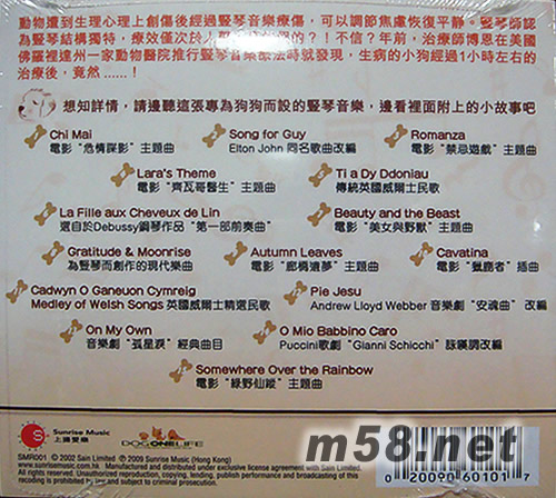 想知詳情,請邊聽這張專為狗狗而設(shè)的豎琴音樂,這看里面附件上的小故事吧。 1。Chi mai 電影“危情諜影”主題曲 2。Song for guy elton jonh 同名歌曲改編 3。Romanza 電影“禁忌游戲”主題曲 4。Laras theme 電影“齊瓦哥醫(yī)生”主題曲 5。Ti day ddoniau 傳統(tǒng)英國威爾士民歌 6。La fille aux cheveux de lin 選自于DEBUSSY 鋼琴作品“第一部前奏曲” 7。Beauty and the beast 電影“美女與野獸”主題曲 8。Gratitude&moorise 為豎琴而創(chuàng)作的現(xiàn)代樂曲 9。Autumn leaves 電影“廊橋情夢“主題曲 10。Cavatina 電影“獵鹿者”插曲 11。Cadwyn o ganeuon cymreig medle of welshsongs 英國威爾士精選民歌 12。Pie jesu andrew lioyd webbr 音樂劇“安魂曲”改編 13。on my own 音樂劇”孤星淚“經(jīng)典曲目 14。O mio babbi caro puccin歌劇 “ giann schicchi"詠嘆調(diào)改編 15。Somewhere over the rainbow 電影“綠野仙蹤”主題曲