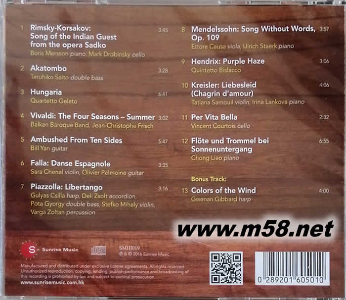 收錄最經典或特別的版本包括林姆斯基-高沙可夫歌劇《薩德科》名曲大提琴改編版、低音大提琴演奏的《紅蜻蜓》、澎湃激昂的韋瓦爾第《四季-夏》、《十面埋伏》古典結他演奏版、豎琴熱情演奏皮亞佐拉的《自由探戈》、克萊斯勒的維也納小提琴三部曲之《愛之悲》...