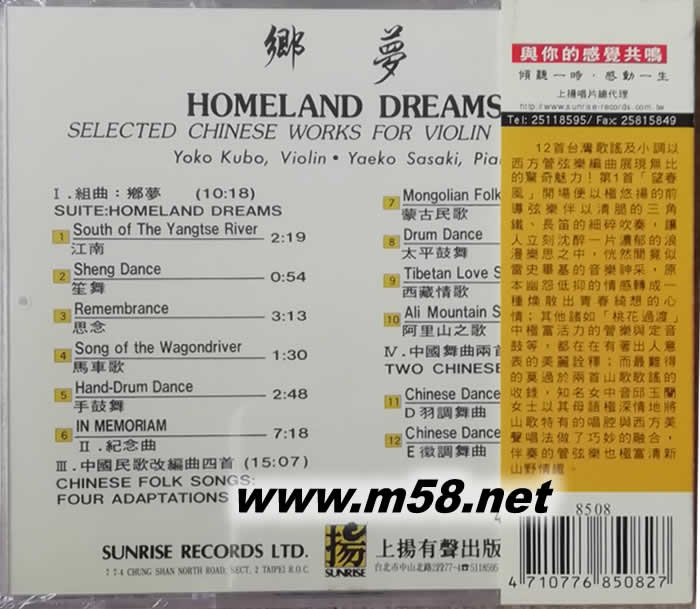 是作曲家及小提琴演奏家黃輔棠(阿鏜)作曲及演奏的二重奏專輯,收錄有組曲「鄉夢」4首中國民歌改編曲及2首中國舞曲。組曲「鄉夢」是作曲家懷念故鄉,藉音樂做一場還鄉夢的作品,共有5段,從春雨料峭的江南水鄉、西南蠻荒的異域、北方的農村景致,以至熱情豪放的新疆風土,皆在音符中躍然跳動。民歌改編曲則是作曲家嘗試用簡單的民歌旋律來發展變化的創作。2首中國舞曲的旋律節奏取材自中國各民族的舞蹈音樂,是不可多得的杰出小品,小提琴與鋼琴搭配流暢,展現纖細的陰柔美感。