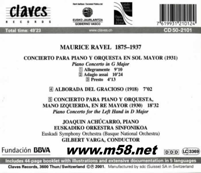 RAVEL: PIANO CONCERTOS & ALBORADA DEL GRACIOSO 拉威爾: G大調(diào)鋼琴協(xié)奏曲/ /小丑的晨歌/ /為左手而作之鋼琴協(xié)奏曲 Basque National Orchestra(m58.net)