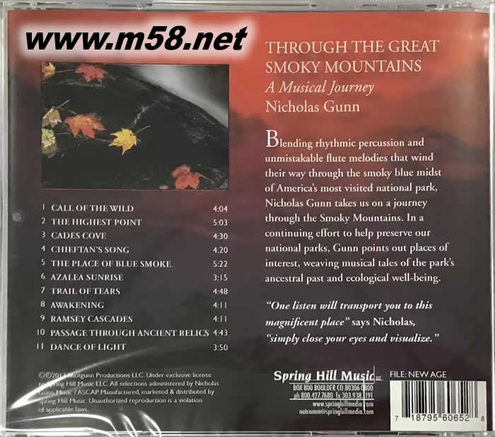 曾盤據(jù)美國BILLBOARD新世界榜32周紀錄的大峽谷長笛圣手-NICHOLAS GUNN居尼古拉斯·金,全新大煙山國家公園音樂大碟,以音樂展現(xiàn)自然之美的功力再創(chuàng)顛峰。長笛的織柔與鼓剛陽,NICHOLAS 神處其技地將兩者做了最令人邀賞的組合,向上攀升的笛聲被震攝的鼓聲誘發(fā)出織柔之外的堅韌,結它點綴的修飾亦異常優(yōu)美。隨著NICHOLAS的音樂,美國大煙山國家公園的美有如親自看見。