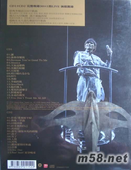 Star! Start!星空傳奇Live Concert(m58.net) 用生命挑戰自我極限的第一場演唱會 跨越國際 頂尖A級團隊+最令人感動的歌聲 一次完整收錄30+1首演唱會經典實錄 最真實感動的一場完美演出 36頁寫真書+歌詞本+Star!Start! 紀念款悠游卡貼 CD1+CD2完整收錄30+1首LIVE 演唱實錄 經典多種語言HIT歌曲 驚艷全場的不同感動 明日晴(桑田佳祐) MONICA(張國榮) 月夜愁(洪一峰) 賈斯汀(SEX BACK) 美麗的稻穗(胡德夫) 超級星光大道比賽最HIT歌曲 安可聲爆破小巨蛋 聽說愛情回來過 人質 背叛 哭了 遇見+迴旋木馬的終端 復古JAZZ風格 濃烈低沉唱腔新挑戰 全場絕對喝采 永遠的微笑 You Don’t trus me at all 對愛渴望
