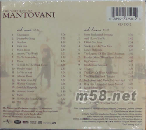 《The very best of Mantovani》(曼陀凡尼精選大碟),系著名的迪卡(DECCA)公司模擬錄音時代的佳作,弦樂甜美絕倫,松香味道十足。雙cd,38首動人樂曲, 98年重新制作發行,坊間應不難覓。其錄音效果秉承了迪卡一貫的特色:低音雄渾,中音豐厚,高音圓滑,其空間感、層次感更屬一流。 該碟的曲目絕對不會令你陌生。如《MOON RI 》、《AROUND THE WORLD》、《AS TIME GOES BY》、《SMOKE GETS IN YOUR EYES》、《AND I LOVE YOU SO》、《MY WAY》等等,在曼陀凡尼的魔棒下,再度魅惑你的耳朵和心靈。尤其是A碟的第一首《CHARMAINE》,為曼陀凡尼的成名作。樂聲甫起,如一線飛瀑傾瀉而下,挾著沁人肺腑的芬芳,流進你荒蕪的心田。在昔年曼陀凡尼的音樂會上,這一段往往贏得經久不息的陣陣掌聲! 該碟的封面頗具特色,如抽象派畫師的夢幻之作:港口,飛鳥,守望者,擁吻的戀人,都在一片黯黃的夕陽里。
