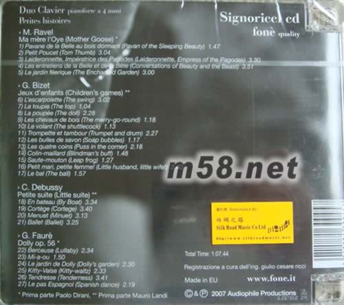 意大利國際著名的<鍵盤二重奏>會演出及收錄貝多芬及舒曼之全部鋼琴作品而馳名于世,但他們對于20世紀法國作曲家的作品頗為鐘情,加上他倆對孩童時的生活充滿了懷念,采用他們天賦的天才,以嫻熟的四手彈奏指法,演繹多首名著經兒童的鋼琴組曲包括[拉威爾的'母鵝'],[比才的'才童游戲'],[德彪西的'小組曲]及[福雷的'洋娃娃'].超凡的技術,活潑的節奏,加上最新的照章技巧,創造出鬼斧神功的效果.
