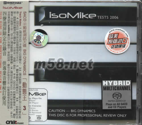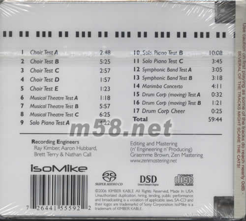 動態王3 示范級測試天碟(m58.net) TRACK NOTES: 1.(測試音色)手搖鈴之位置變化. 2-3.(測試動態)強勁樂器敲打加上尖叫聲的散發 4.(試定位)豎琴與長笛慢慢地從左至右 5.鋼琴聲劃破合唱團而出 6-8.一時沖動的念頭,踢踏舞加練習時之鋼琴聲,可算是[盜錄]杰作 9-10.(試音色)即與鋼琴獨奏 11.鋼琴獨奏,空氣感十足 12-13.(測試動態)交響樂團 14.(測試音色與定位)馬林巴琴協奏曲 15-17.首度嘗試把ISOMIKE搬出戶外錄音,軍鼓試演,雖有少許收音不足,但整個環境表現出眾. 四聲道屏障定位錄音 供專業音響校訂使用