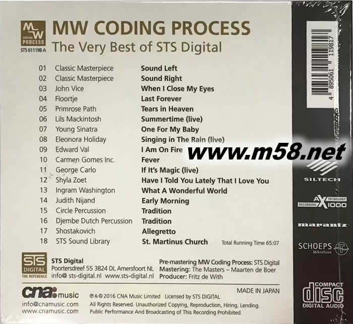 荷蘭發(fā)燒品牌STS DIGITAL成立於1972年,公司由四個(gè)不同部門組成,分別是STS TELEVISION PRODUCTION、STS VIDEO PRODUCTION、STS PROJECTS及STS DIGITAL。尤以STS DIGITAL最為人所熟悉,它代表著發(fā)燒天碟錄音,錄音和后期製作技術(shù)更是業(yè)界先驅(qū)。打從STS DIGITAL推出MWCODINGPROCESS?首張作品后,發(fā)燒友均讚不絕口、全力追捧和收藏。今個(gè)夏季,STS DIGITAL挑選18首出色作品,發(fā)表首張MWCODINGPROCESS?編碼“超級(jí)精選”。受惠於這編碼,人聲比原作品更溫暖豐厚,像似黑膠唱片聲音,動(dòng)態(tài)更不可思議地寬闊,音樂(lè)細(xì)致之處更勝?gòu)那?。荷蘭直送,德國(guó)SONOPRESS印碟。不措工本,全球限量首批2000張,以人手製作凸字熨銀封套連獨(dú)一無(wú)二編號(hào),絕對(duì)值得收藏。鑒往知來(lái)MWCODINGPROCESS?定是明天製作指標(biāo)。