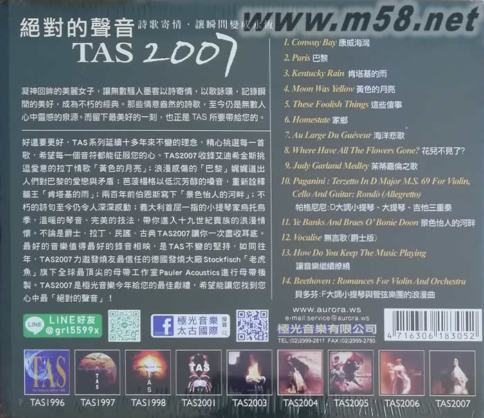 TAS 絕對(duì)的聲音CD 2007 詩(shī)歌寄情(m58.net) 詩(shī)歌寄情.讓瞬間變成永恆 TAS給你無(wú)法抵抗的美好! 凝神回眸的美麗女子,讓無(wú)數(shù)騷人墨客以詩(shī)寄情,以歌詠嘆,記錄瞬間的美好,成為不朽的經(jīng)典。那些情意盎然的詩(shī)歌,至今仍是無(wú)數(shù)人心中靈感的泉源。而留下最美好的一刻,也正是TAS所要帶給您的。 好還要更好,TAS系列延續(xù)十多年來(lái)不變的理念,精心挑選每一首歌,希望每一個(gè)音符都能征服您的心。TAS2007收錄艾迪希金斯挑逗愛(ài)意的拉丁情歌「黃色的月亮」;浪漫感傷的「巴黎」娓娓道出人們對(duì)巴黎的愛(ài)戀與矛盾;芭菠楊格以低沉芳醇的嗓音,重新詮釋貓王「肯塔基的雨」;兩百年前伯恩斯寫(xiě)下「景色怡人的河畔」;不朽的詩(shī)句至今仍令人深深感動(dòng);義大利首屈一指的小提琴家烏托烏季,溫暖的琴音、完美的技法,帶你進(jìn)入十九世紀(jì)貴族的浪漫情懷。不論是爵士、拉丁、民謠、古典TAS2007讓你一次盡收耳底。 最好的音樂(lè)值得最好的錄音相映,是TAS不變的堅(jiān)持,如同往年,TAS2007力邀發(fā)燒友最信任的德國(guó)發(fā)燒大廠Stockfisch「老虎魚(yú)」進(jìn)行母帶后製。TAS2007是極光音樂(lè)今年給您的最佳獻(xiàn)禮,希望能讓您找到您心中最「絕對(duì)的聲音」!