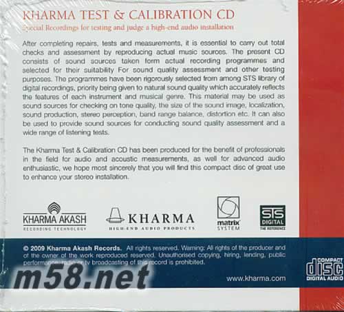 KHARMA TEST & CALIBRATION KHARMA校正與測試天碟(m58.net) 20年前Chesky Records推出的Jazz Sampler & Audiophile Test CD Vol.1是市上首張實用價值極高的試碟,用以測試音響系統的音場、定位、相位及低電平線性可說快而準,其后在92年及94年分別推出的Vol.2及Vo1.3同樣有趣好玩。令發燒友大開耳界,閣下可能亦買齊三張。可惜近年類似的試機及校聲專用CD乏善可陳。本碟是我們期待已久的發燒級試機CD,看看封面那套Boulde前、后級及一對過百萬元的Kharma Exqiusite Reference揚聲器便知有「聽頭」。全碟共25段音樂均由荷蘭發燒label STS Digital唱片公司著名錄音師Fritz de With錄音及混音,所有咪線、訊號線及電源線均使用Kharma出品的極品級貨色,AD轉換器用Weiss Gambit系列,數碼錄音機用最先進的Tascam DVD-l0OOR,在Kharma總部的一號試音室進行混音,以Kharma Exquisite MP350功放及Exquisite Midi EXQ-M-lA揚聲器鑑聽。 錄音師詳細說明25段音樂測試的聲音特點及大家須留意的細節。頭盤5段是例牌菜:左、右、單聲道、立體聲及反相測試,一試便知有否駁錯線!Track4與Track5是同一段立體聲音樂,前者正相,后者反相,若兩件XLR極性不同的器材(2正3負→3正2負)以平衡線連接,聽到的聲音便剛巧相反,你會聽到是Track4反相,Track5正相,發燒友必須查明每件器材XLR輸出的極性『註:Accuphase,Marantz,Luxman,Burmester長期以來的XLR極性是3正,但日本Sony,Yamaha,Denon,Esoteric,Pioneer及幾乎所有歐美機是2正』。Track6及7用槍聲分別試左、右聲道的發聲速度及自然殘響時間,若然左、右聲道效果有差異,顯示皇帝位與左、右喇叭位置不對稱,你必須用拉尺量度距離微調喇叭擺位。Track8試交響樂團的立體聲連貫性,錄音師話大聲段落易出但輕聲片段較難。Track9試音像的高度感。TracklO可試特色古鍵琴的驚人深度感。Trackll試教堂管風琴,聽聽是否有強烈的置身於教堂內的臨場感。Trackl2試教堂的堂音空間感,一左一右兩班「非專業」的修女對唱必須有連貫無駁口的寬宏空間感。Trackl3試五個鼓的動態與節奏感,敲打音叉的金屬質感。Trackl4試起動與完結的瞬態響應,木管樂團的堂音與動態表現。Trackl5試置身於錄音現場的真實感,你可以清楚聽到聽眾發出的雜音。Trackl6以小提琴、手風琴及double bass各一(左、中、右)的近咪錄音玩聲。頭1分27秒只是近咪收錄的直接聲,之后加入兩支收錄堂音咪所捕捉的堂音,小提琴的發音位置必須夠高,若然離地不足4呎便不合格。Trackl7試猝發強音,排笛聲必須夠乾凈純凈,若然排笛的最強音有拆聲失真就不合格。Trackl8以絃樂四重奏(整間以木建造的教堂提供極佳的天然殘響)試鮮烈的音場音像與臨場感,大提琴聲真實無比。Trackl9至22四段音樂試接線(Crystal Cable,Kharma,Siltech及vdH),你可聽出哪段用哪款線嗎?Track23是在一間5x20米的小型爵士俱樂部的現場錄音,大家須盡量調高音量去還原出現場的音樂動態范圍。Track24是錄音室錄音,STS最近期的皇牌女歌手Judith Nijland口形高企,定位非常清晰,整體聲音開揚通清。Track25以近咪錄音收錄了最甜美悅耳的人聲清唱,加入Marantz AXlO00製造的殘響,令人聲聽來更自然動聽。