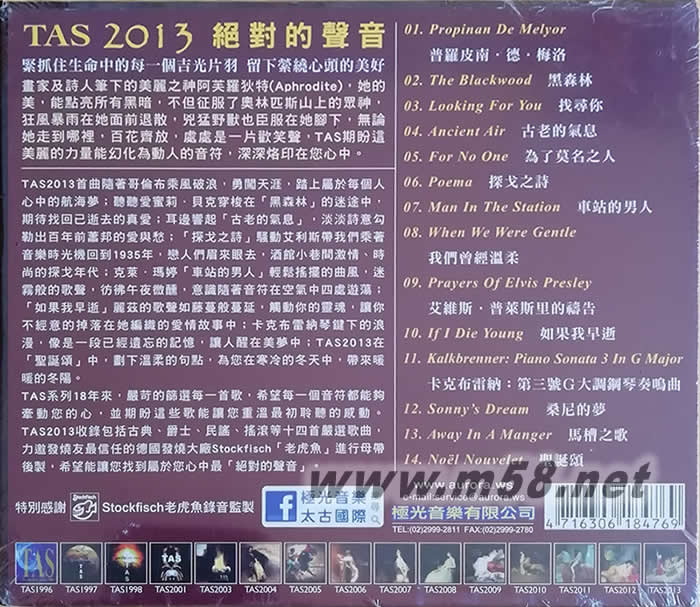 01. Propinan De Melyor 普羅皮南.德.梅洛 New London Consort 新倫敦合奏團02. The Blackwood 黑森林 Emily Barker & The Red Clay Halo 愛蜜莉.貝克與紅粘土光環樂團 03. Looking For You 找尋你 Allan Taylor 亞倫.泰勒 04. Ancient Air 古老的氣息 John Di Martino’s Romantic Jazz Trio 約翰.迪.馬替農浪漫三重奏 05. For No One 為了莫名之人 Nicki Parrott & Ken Peplowski 妮基.派洛特與肯.佩普洛夫斯基 06. Poema 探戈之詩 Otros Aires 騷動艾利斯 07. Man In The Station 車站的男人 Claire Martin & John Martyn 克萊.瑪婷與約翰.馬丁 08. When We Were Gentle 我們曾經溫柔 Kira Skov 綺拉.史科芙 09. Prayers Of Elvis Presley 艾維斯.普萊斯里的禱告 David Munyon 大衛.慕楊 10. If I Die Young 如果我早逝 Liz Madden 麗茲.瑪登 11. Kalkbrenner: Piano Sonata 3 In G Major 卡克布雷納:第三號G大調鋼琴奏鳴曲 Luigi Gerosa 路易吉.葛羅薩 12. Sonny’s Dream 桑尼的夢 Paul O’Brien 保羅.歐布里恩 13. Away In A Manger 馬槽之歌 Bin Huang 黃濱 14. Noël Nouvelet 圣誕頌 Liz Madden 麗茲.瑪登