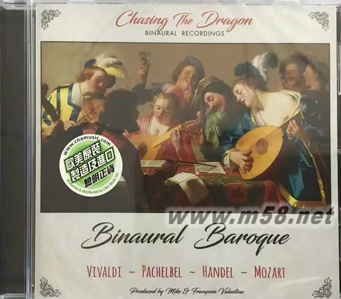 Chasing The Dragon Binaural Baroque (室樂巴洛克)(m58.net) Chasing The Dragon人頭錄音(Neumann Binaural Head Recordings)第三擊,今次選定在 Air Studio London錄音,一所非常出名之錄音室。無論是流行歌手,爵士巨人,世界古典音樂團隊,均有這所錄音室的紀錄。今次發燒咪(Mike Valentine)挑選了韋瓦第吉他協奏曲,結婚音樂熱選作品約翰•帕海貝爾卡農,巴洛克時期並列的兩位偉大音樂家之一韓德爾,豎琴協奏曲,韋華第作品Sinfonia alla Rustica及莫札特小夜曲,首首名曲,精彩演繹。再次找來愛爾蘭豎琴家Jean Kelly,完美演奏,技術和優雅的代表,令人印象深刻。世界古典吉他界嶄露頭角並迅速升起的年輕音樂家,曾二次到到訪中國,當今頂級吉他演奏家,摩根•希曼斯基(Morgan Szymanski)超卓演奏,引人入勝,演出使人難以忘懷。Neumann超卓人頭錄音技術,立體地呈現眼前。