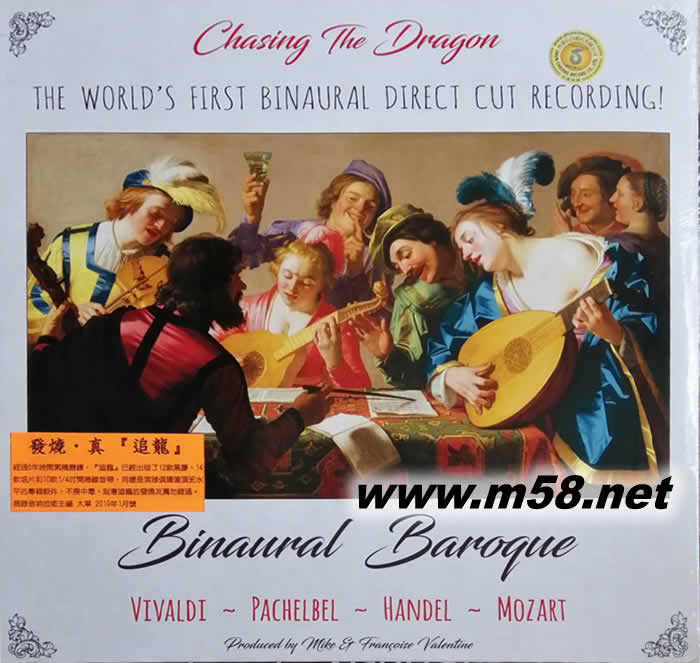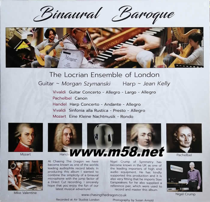 Chasing The Dragon人頭錄音(Neumann Binaural Head Recordings)第三擊,今次選定在 Air Studio London錄音,一所非常出名之錄音室。無論是流行歌手,爵士巨人,世界古典音樂團隊,均有這所錄音室的紀錄。今次發燒咪(Mike Valentine)挑選了韋瓦第吉他協奏曲,結婚音樂熱選作品約翰•帕海貝爾卡農,巴洛克時期並列的兩位偉大音樂家之一韓德爾,豎琴協奏曲,韋華第作品Sinfonia alla Rustica及莫札特小夜曲,首首名曲,精彩演繹。再次找來愛爾蘭豎琴家Jean Kelly,完美演奏,技術和優雅的代表,令人印象深刻。世界古典吉他界嶄露頭角並迅速升起的年輕音樂家,曾二次到到訪中國,當今頂級吉他演奏家,摩根•希曼斯基(Morgan Szymanski)超卓演奏,引人入勝,演出使人難以忘懷。Neumann超卓人頭錄音技術,立體地呈現眼前。