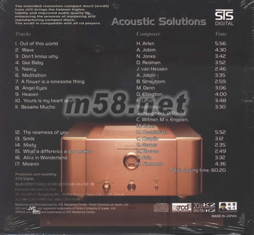 價格為估,以實到貨為準! ACOUSTIC SOLUTIONS原音極品XRCD(m58.net) 請點看產(chǎn)品正、背面大圖 NINTH EDITION THE ESSENCE OF MUSIC MADE IN JAPAN