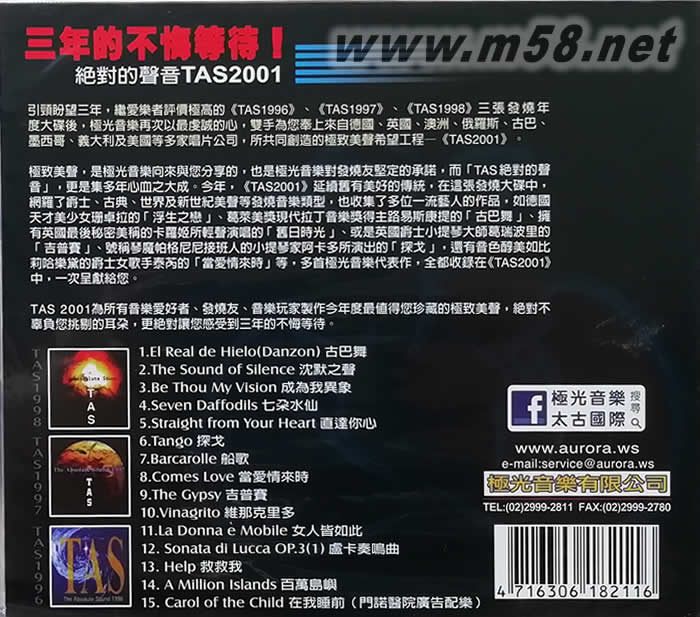 TAS 絕對的聲音CD 2001(m58.net) 請點看產品正、背面大圖 引頸盼望三年,繼愛樂者評價極高的《TAS1996》、《TAS1997》、《TAS1998》三張發燒年度大碟后,極光音樂再次以最虔誠的心,雙手為您奉上來自德國、英國、澳洲、俄羅斯、古巴、墨西哥、意大利及美國等多家唱片公司,所共同創造的極致美聲希望工程--《TAS2001》。 極致美聲,是極光音樂向來與您分享的,也是極光音樂對發燒友堅定的承諾,而[TAS絕對的聲音],更是集多年心血之大成。今年,《TAS2001》延續舊有美好的傳統,在這張發燒大碟中,網羅了爵士、古典、世界及新世紀美聲等發燒音樂類型,也收集了多位一流藝人的作品,如德國天才美少女珊卓拉的[浮生之戀]、葛萊美獎現代拉丁音樂獎得主路易斯康提的[古巴舞]、擁有英國最后秘密美稱的卡蘿姬所輕聲演唱的[舊日時光]、或是英國爵士小提琴大師葛瑞波里的[吉普賽]、號稱琴魔帕格尼尼接班人的小提琴家阿卡多所演出的[探戈],還有音色醇美如比莉哈樂黛的爵士女歌手泰芮的[當愛情來時]等,多首極光音樂代表作,全都收錄在《TAS2001》中,一次呈獻給您。 TAS2001為所有音樂愛好者、發燒友、音樂玩家制作今年度最值得您珍藏的極致美聲,絕對不辜負您挑剔的耳朵,更絕對讓您感受到三年的不悔等待。