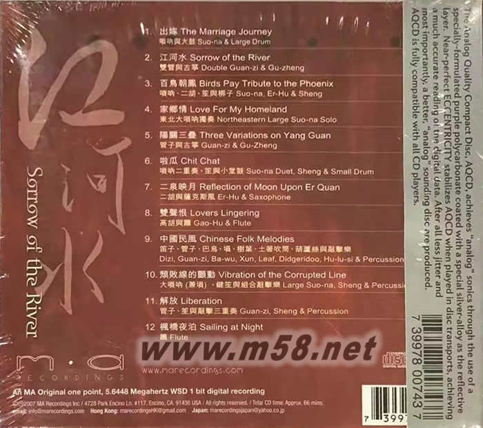 江河水 嗩吶版 AQCD(m58.net) 1998年榮獲美國紐約Pro Musicians國際大賽中唯一大獎!他使嗩吶大放異彩,是音樂會上光彩照人的明星 郭雅志的這張個人唱片,就是他超凡的藝術靈性與精湛的演奏技巧最淋漓盡致而且最令人歎為“聽”止的融合結晶,也是迄今為止世間唯一一張以嗩吶擔綱主奏的中樂發燒唱片。為了它,友人林錫堅(香港現代音像有限公司掌門人)精心策劃,友情延請名頭愈來愈大的美國獨立唱片廠牌M·A Recordings老闆兼錄音怪杰Todd Garfinkle攜他的獨門錄音名器專程來港操刀錄音。對教堂錄音情有獨鍾的Todd Garfinkle在林錫堅引領下走遍全港大小教堂,終于在位于西貢清水灣半山腰的百年名校——三育書院里覓到了景輝堂這個理想之地。景輝堂可容納350人聞道,堂音豐滿悅耳,殘響自然理想,既是錄音師又是鋼琴家的Todd Garfinkle巧手稍加擺弄,慧心妙用無窮,與郭雅志靈犀互通,才成就這一張空前靚聲的中樂吹管天碟