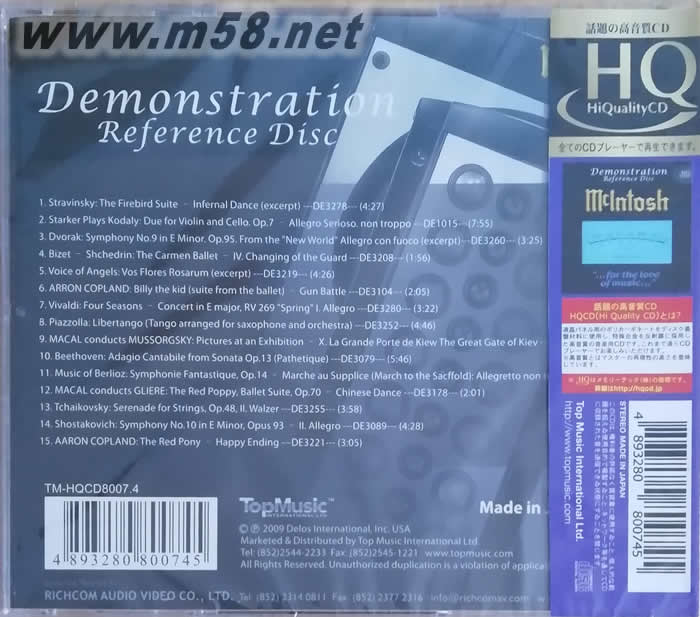 Top Music為美國元老級音響名牌McIntosh(麥景圖)度身製作的試音碟,就擁有了作為一張優秀發燒試音碟的一切必備要素,不僅發燒友用之試音會愛不釋手,"耳油淌滿地",單論欣賞性,對初識古典音樂人士而言也具有很強的吸引力。這張試音碟的選曲悉數來自美國發燒錄音廠家Delos的錄音母帶;內容則完全以古典音樂中精華樂段為主,分別來自絲特勒文斯基《火鳥組曲》、德沃夏克《新世紀交響曲》、比才《卡門交響曲》、科普蘭的《牛仔比利》、維瓦爾弟的《四季》等熱門的作品,想必專門編輯一份古典音樂入門的教科書,也不過是選取這些樂段做示範。音樂之好聽,不敢說百分之百的人都無法抗拒,但至少我的一個從來不聽古典的朋友聽到之 后,就搶去聽了好久都不肯歸還。