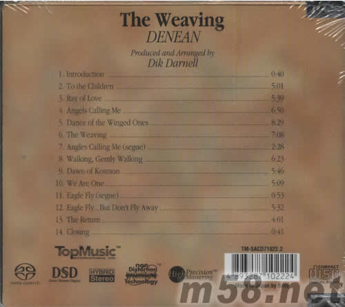 THE WEAVING織夢SACD(m58.net) DENEAN的《The Weaving織夢》《Thunder蝶舞春雷》大家都很熟悉,Denean是一位極具音樂才華的才女,在這專輯中還負責作曲、編曲、演唱鋼琴伴奏等工作,一塵不染的旋律及曼妙的伴奏,是全球一致叫好叫座的熱門金碟。 她的作品,無論旋律的編排,她的鋼琴演奏,更主要的她的演唱,都是非常實實在在,而沒有現在流行的音場的ECHO,或者添加電子合成器的渲染,就是靠著簡潔而優(yōu)美的旋律,甜美而實質的歌聲來打動人,賦予每一首作品一個生命般充實的內涵和親切感。聽來如同茗品一盅濃厚的烏龍茶般的有質感。而那種甜美,卻是甜而不膩,當旋律已然淡去,卻依然有種回味,而余香仿佛依舊。 這是一張講述一個農家女的心情,充滿了對夢想的憧憬,未來的渴望,而有些曲目的名字,卻又像是一個男孩的感覺,比如eagle in my heart,tai chi好像不大會針對一個女孩子的而言,而like water和your own soul卻又像男孩子對女孩子的表白。但是,也可以描述位女孩子的內心活動,更因為是DENEAN的演唱,聽來偏女性化多點。繁瑣了,累了,只想閉上眼睛,不管內容了,只想聆聽一種喜歡,一種滋潤。這就是聆聽這張作品的最后結局.