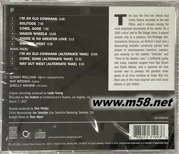 另外"There Is No Grester Love"成了一首情歌,連桑尼的音都變得飽滿而溫潤,這次獨特的樂器編制,讓這三人的感情得到了完全的抒發(fā),對聽眾而言,這是一次絕無僅有的機(jī)會,同時體驗二位出眾的爵士名家,這張專輯也讓你能夠神遊廣大的美國大西部所帶給我們美好的回憶。