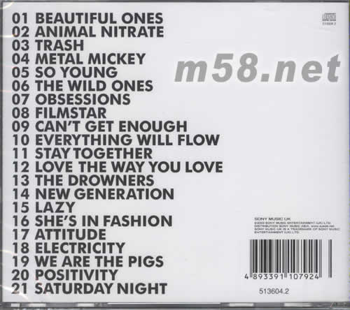 1. Beautiful Ones 2. Animal Nitrate 3. Trash 4. Metal Mickey 5. So Young 6. The Wild Ones 7. Obsessions 8. Filmstar 9. Can't Get Enough 10. Everything Will Flow 11. Stay Together 12. Love The Way You Love 13. The Drowners 14. New Generation 15. Lazy 16. She's In Fashion 17. Attitude 18. Electricity 19. We Are The Pigs 20. Positivity 21. Saturday Night