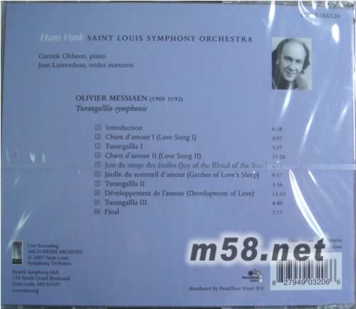 OLIVIER MESSIAEN (1908-1992) Turangalîla-symphonie 1 Introduction 6:28 2 Chant d<0x2019>amour I (Love Song I) 8:07 3 Turangal<0x00EE>la I 5:27 4 Chant d<0x2019>amour II (Love Song II) 11:26 5 Joie du sange des <0x00E9>toiles (Joy of the Blood of the Stars) 6:13 6 Jardin du sommeil d<0x2019>amour (Garden of Love<0x2019>s Sleep) 9:57 7 Turangal<0x00EE>la II 3:36 8 D<0x00E9>veloppement de l<0x2019>amour (Development of Love) 11:10 9 Turangalîla III 4:40 10 Final