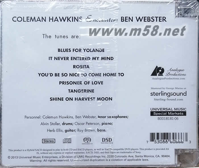 ENCOUNTERS 兩位薩克斯大師相遇 SACD(m58.net) 柯曼·霍金斯(Coleman Hawkins,1904-1969),美國演奏家,是爵士樂歷史上第一位重要的次中音薩克斯管演奏家,同時他也是有史以來最偉大的演奏家之一。他的演藝生涯持續了整整四十年(1925年至1965年),在此期間他的技藝堪與任何一位同行抗衡。 不僅以器樂音色圓潤飽滿著稱,招牌滑音更是優美流暢,他總能於吹奏之際透過細膩迷情的柔性延展傳遞出最馥郁芳馨的搖擺興味,也因此除了擁有“次中音薩克斯風之父”美稱