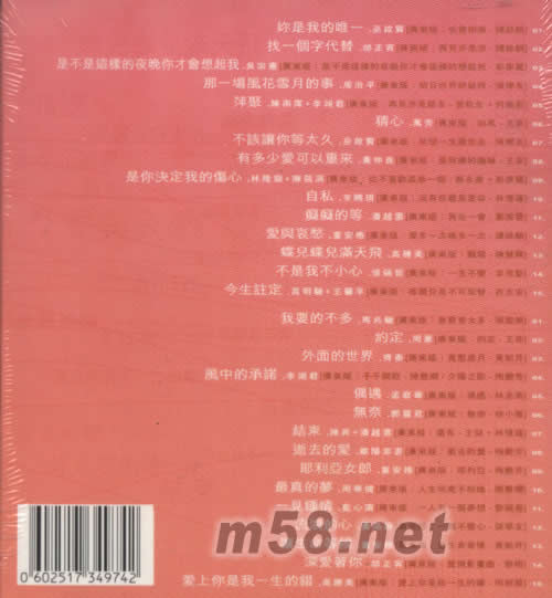 DISC 1 01. 你是我的唯一 -巫啟賢(廣東版:也曾相識-譚詠麟) 02. 找一個字代替 -邰正宵(廣東版:再見亦是淚-譚詠麟) 03. 是不是這樣的夜晚你才會想起我 -吳宗憲(廣東版:是不是這樣的夜晚你才會這樣的想起我-彭家麗) 04. 那一場風花雪月的事 -周治平(廣東版:明日世界終結時-張學友) 05. 萍聚 -陳雨霈+李翊君(廣東版:再見亦是朋友-曾航生/何婉盈) 06. 猜心 -萬芳(廣東版:如風-王菲) 07. 不該讓你等太久 -巫啟賢(廣東版:只想一生跟你走-張學友) 08. 有多少愛可以重來 -黃仲崑(廣東版:愛與痛的邊緣-王菲) 09. 是你決定我的傷心 -林隆璇+陳筱涓(廣東版:從不喜歡孤單一個-蘇永康/彭家麗) 10. 自私 -辛曉琪(廣東版:沒有你還是愛你-林憶蓮) 11. 癡癡的等 -潘越云(廣東版:再坐一會-鄺美云) 12. 愛與哀愁 -童安格(廣東版:愛多一次痛多一次-譚詠麟) 13. 蝶兒蝶兒滿天飛 -高勝美(廣東版:飄雪-陳慧嫻) 14. 不是我不小心 -張鎬哲(廣東版:一生不變-李克勤) 15. 今生注定 -高明駿+王磬平(廣東版:唯獨你不可取替-許志安) DISC 2 01. 我要的不多 -馬兆駿(廣東版:無需要太多-張國榮) 02. 約定 -周蕙(廣東版:約定-王菲) 03. 外面的世界 -齊秦(廣東版:青蔥歲月-黃凱芹) 04. 風中的承諾 -李翊君(廣東版:千千闋歌-陳慧嫻/夕陽之歌-梅艷芳) 05. 偶遇 -孟庭葦(廣東版:偶遇-林志美) 06. 無奈 -鄧麗君(廣東版:無奈-徐小鳳) 07. 結束 -陳升+潘越云(廣東版:還有-王杰+林憶蓮) 08. 逝去的愛 -歐陽菲菲(廣東版:逝去的愛-梅艷芳) 09. 耶利亞女郎 -童安格(廣東版:耶利亞-梅艷芳) 10. 最真的夢 -周華健(廣東版:人生何處不相逢-陳慧嫻) 11. 一見鐘情 -藍心湄(廣東版:一人有一個夢想-黎瑞恩) 12. 流浪的心 -黃品源(廣東版:一顆不變心-張學友) 13. 讓生命等候 -童安格(廣東版:若生命等候-黃凱芹) 14. 深愛著你 -邰正宵(廣東版:愛情影畫戲-黎明) 15. 愛上你是我一生的錯 -高勝美(廣東版:愛上你是我一生的錯-何婉盈)
