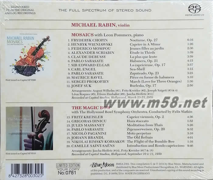 拉賓最強小品集 Mosaics & The Magic Bow SACD(m58.net) 美國小提琴家拉賓(Michael Rabin),在其短暫藝術生涯中,留下的錄音相當少,以小提琴藝術的世界,拉賓帶給別人之感受實是"太厲害了"!他技巧驚人,音色濃烈,激昂與動力感無出其右。曾經在其6CD精選集推出過的作品,《Mosaic》及《The Magic Bow》二合為一推出,一碟共20首歌曲。原錄音均在1959年3及9月份收錄,被稱譽為不可多得之傳世名盤,更是樂迷拼死以求之小提琴精品集。首批號碼版Numbered Edition│Hybrid Stereo SACD (Super Audio CD) │ Plays on All SACD and CD Players.