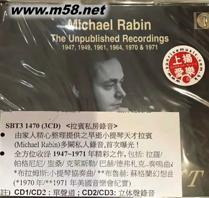 拉賓私房錄音The Unpublished Recordings 1947, 1949, 1961, 1964, 1970 & 1971 (3CD套裝)(m58.net) 由家人精心整理提供之早逝小提琴天才拉賓(Michael Rabin)多闕私人錄音, 首次曝光 ! 全方位收錄1947~1971年精彩之作, 包括: 拉羅/ 帕格尼尼/ 圣桑/ 克萊斯勒/ 巴赫/德弗札克..奏鳴曲&*布拉姆斯: 小提琴協(xié)奏曲/**布魯赫: 蘇格蘭幻想曲(*1970年/**1971 年美國音樂會(huì)紀(jì)實(shí)) (註) CD1/CD2 : 單聲道 ; CD2/CD3 : 立體聲