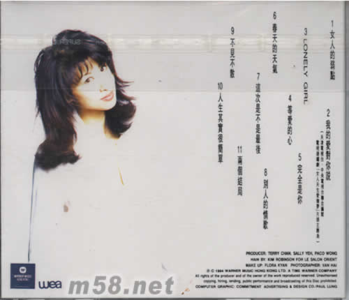 1、女人的弱點 2、我的愛對你說 3、LONELY GIRL 4、等愛的心 5、完全是你 6、春天的天氣 7、這次是不是最后 8、別人的情歌 9、不見不散 10、人生其實很簡單