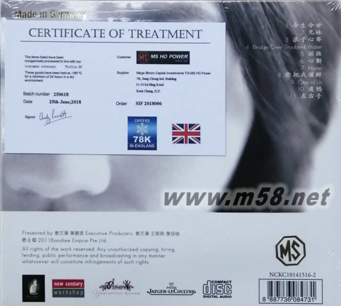 陳潔儀 重譯重奏 78K CD 冷凍CD(m58.net) 經(jīng)英國名廠 78K 冷凍處理 令背景寧靜,結(jié)像、動態(tài) 、人聲 更細致 Made in Germany LIMITED EDITION MS HD POWER與英國軍事冷凍專家共同合作研發(fā),能大幅升導(dǎo)電性能的方法,稱為“78K冷凍處理”。制作過得極嚴謹,務(wù)求滿足頂級玩家的需要。唱片經(jīng)過78K冷凍處理中,音樂感更豐富,音場更開揚,動態(tài)更結(jié)實。