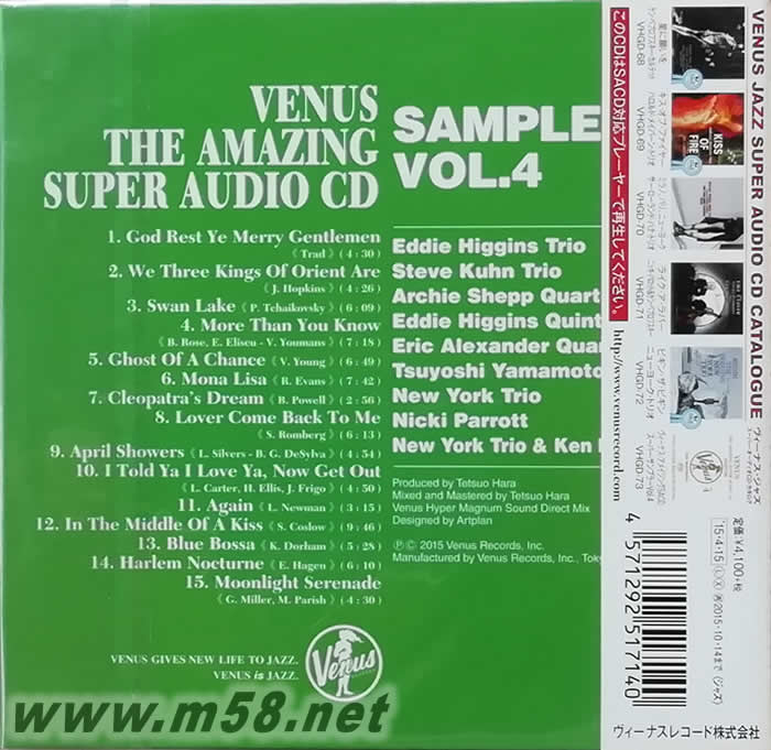 夢幻發(fā)燒試碟王 4 VENUS THE AMAZING Super Audio CD SAMPLER VOL.4(限量單層SACD)(m58.net) 日本著名發(fā)燒爵士品牌Venus Records選輯旗下十五首超正錄音,多位音樂名家及歌手分別演繹多首名曲如: ,多位名家的精彩演出帶來了永恒的經(jīng)典金曲,以單層SACD推出,這個備受發(fā)燒友及音響界推崇的制式提供如在現(xiàn)場欣賞的靚絕音效。原裝日本豪華厚紙限量版。(只能以SACD機播放)