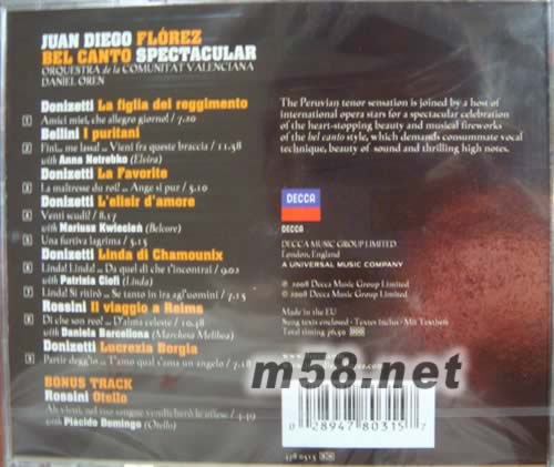 Bel Canto Spectacular佛瑞茲 壯麗美聲(m58.net) 自1996年八月在羅西尼歌劇節首次登臺至今,佛瑞茲不僅已贏得多個國際聲樂重要獎項,更獲得國際媒體與樂迷如潮的佳評,他那非凡的技巧,燦爛的歌聲,在在閃燿著動人心弦的光輝,舉手投足間散發出魅力獨具的風采,讓臺下聽眾為之迷醉。許多幾乎失傳的歌劇也因為他的出現而再度復甦。而那些以往只存於文字間的傳奇,記載著一百五十年前傳奇男高音們演唱盛況的辭句,如今因為佛瑞茲而再度在我們面前化為真實與永恆。無怪乎國際各大媒體皆將佛瑞茲譽為當今最偉大的美聲男高音,已被譽為高音D歌王的他也同時被紐約太陽報讚譽是「...羅西尼男高音之王,董尼才第男高音之王,白利尼男高音之王...」而這個傳奇仍在持續進階演化!在這張被稱為「佛瑞茲與朋友們」的專輯當中,佛瑞茲以歌劇界十分少見的作法,熱情邀請當今一流演唱家如多明哥,女高音聶翠柯等好友與他共同演唱并參與錄音,除了具有令其自豪的獨特性,佛瑞茲更在選曲與演唱方面,進一步證明他在現今美聲領域至高無上的定位。