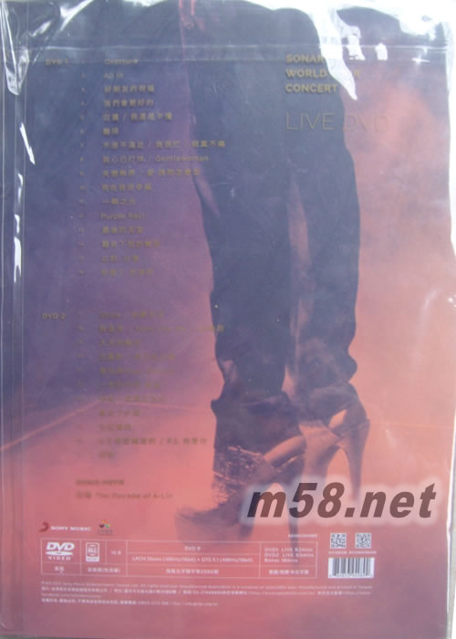 系統規格: DVD9 音效選擇: LPCM Stereo (48KHz/16bit) / DTS 5.1 (48KHz/16bit) 螢幕比例:16:9 時間長度: DVD1 演唱會 82分/ DVD2 演唱會 65分+Bonus Movie18分 區碼:全區 字幕: 中文 繁體/ 簡體 A-Lin聲吶SONAR世界巡迴演唱會|DVD 曲目 DVD 1 1. Overture 2. All In 3. 好朋友的祝福 4. 我們會更好的 5. 位置 / 我還是不懂 6. 難得 7. 不是不滿足 / 我很忙 / 寂寞不痛 8. 我心已打烊 / Gentlewoman 9. 失戀無罪 / 愛 請問怎么走 10. 現在我很幸福 11. 一瞬之光 12. Purple Rain 13. 最后的天堂 14. 聽見下雨的聲音 15. 以前,以后 16. 幸福了 然后呢 DVD 2 17. Shine / 快樂生活 18. 我值得 / More Like Me / Lin極限 19. 大大的擁抱 20. 沾醬歌 / 南王系之歌 21. 嗚哇嗚(feat. Matzka) 22. 一想到你呀 組曲 23. 給我一個理由忘記 24. 拿走了什么 25. 忘記擁抱 26. 分手是需要練習的 / P.S. 我愛你 27. 回家 BONUS MOVIE [ 回聲 The Decade of A-Lin ]