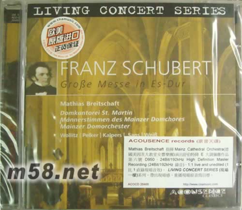 SCHUBERT: MASS IN E FLAT MAJOR, D950 原音天碟(m58.net) Katharina Wollitz, sopran Gudrun Pelker, Alt Johannes Kalpers, Tenor Daniel Sans, Tenor Hans-Otto Weiβ, Bss 1:1 LIVE AND UNEDITED ACOUSENCE records (原音天碟)… the acoustic experience 2004年成立,德國迅速走紅,錄音理念以發(fā)燒音效配上感動(dòng)聽眾之樂章為主。當(dāng)中LIVING CONCERT SERIES (現(xiàn)場一樣系列)是其最出眾作品系列,帶出現(xiàn)場感,重播現(xiàn)場原音為目標(biāo)。24Bit/192kHz High Definition Master Recording (24Bit/192kHz 錄音)。