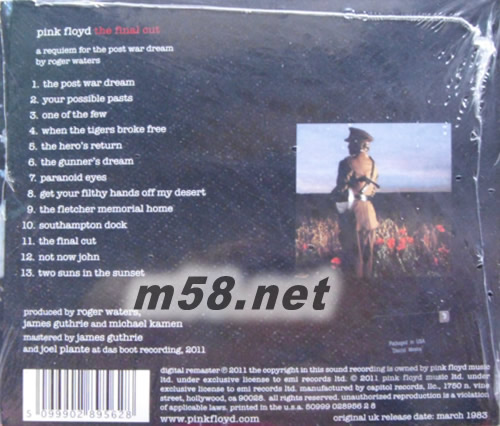 The Final Cut最后一幕(美版)(m58.net) ◎ 平克佛洛伊德之探索入門系列12 ◎ 2011年全新數位化母帶重製工程由《The Wall》專輯製作人與錄音名匠James Guthrie擔任 ◎ 內附流行藝術大師Storm Thorgerson全新設計12頁的CD內頁本 ◎ 專輯登上英國流行專輯榜冠軍 ◎ 核心人物Roger Waters最后一張參與錄製的平克佛洛伊德樂團專輯 ◎ 控訴英國首相柴契爾與福克蘭群島戰爭決策的反戰專輯 平克佛洛伊德原本計劃為根據概念專輯《The Wall》內容所拍攝的電影【血灑暴力墻】製作一張包含舊作新錄音與全新創作歌曲的原聲帶,不料,1982年四月間,英國與阿根廷爆發福克蘭群島戰爭,由於樂團核心人物Roger Waters對於當時英國首相柴契爾的出兵決定、深感不滿,於是放棄了《血灑暴力墻》電影原聲帶的製作計劃,決定製作一張反戰主題的概念專輯,專輯的名稱《The Final Cut》的靈感來自於莎士比亞名劇【凱薩大帝】中的對白「this was the most unkindest cut of all」,由Roger Waters擔綱創作的歌曲,以陣亡的英國軍人的背叛為主題,描述軍人懷抱著戰爭之后、一定會帶來和平的美麗夢想,踏上戰場,而領導者卻不愿尋求其它解決紛爭的方式,只想訴諸戰爭的行徑。Roger在《The Final Cut》專輯中批判的就是領導者一心戰爭、欺騙上戰場的軍人,犧牲性命的背叛行為,專輯的女主角Maggie指的就是柴契爾。專輯中有Roger追憶在二次世界大戰中犧牲的父親,同時指陳領導者背叛軍人的專輯主題的〈The Post War Dream〉,還有斥責免於暴政統治的戰爭幻夢,探究恐怖主義的〈The Gunners Dream〉,描述一個著迷於戰爭與主控權的世界的警世之歌〈Two Suns In The Sunset〉。專輯在1983年三月發行,專輯登上英國流行專輯榜冠軍,晉升全美流行專輯榜第六名,這也是Roger Waters在1983年宣布離團之前、所參與的最后一張專輯。2011年重新發行版本由1980年以《The Wall》專輯勇奪葛萊美獎最佳錄音的錄音巨擘James Guthrie擔任全新數位化母帶重製技術製作,專輯內附流行藝術大師Storm Thorgerson全新設計長達12頁的CD內頁本。