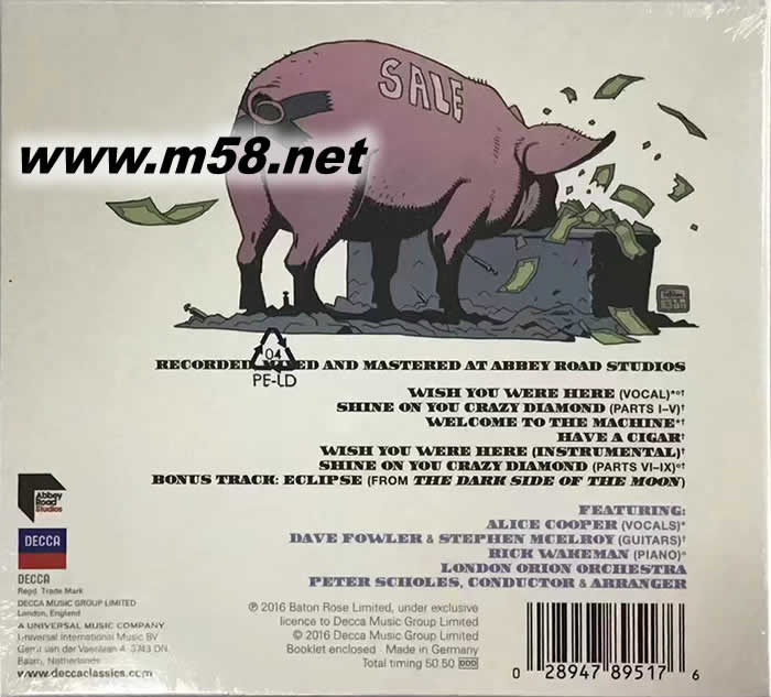 Wish You Were Hers Various(m58.net) 歡慶 經(jīng)典錄音冠*天碟 發(fā)行40周年 磅礡再生! 搖滾天師 Alice Cooper 及 Rick Wakeman 跨刀 王*吉他手 Dave Fowler 及 Steve McElroy 助陣 彼特史密斯(Pete Smith)主導(dǎo) 史庫(kù)茲(Peter Scholes)編曲/指揮 倫敦獵戶(hù)座管弦樂(lè)團(tuán) 擔(dān)綱演奏 震撼加收 永恆金曲 『月之暗面』‘The Dark Side Of The Moon’ 《Wish You Were Here》(愿你在此)是搖滾天團(tuán)-平克弗洛伊德於1975年9月發(fā)行的第9張錄音室大碟。當(dāng)年破天荒採(cǎi)用最先進(jìn)錄音技術(shù),更以獨(dú)步創(chuàng)新的概念及作法,打造西洋樂(lè)壇獨(dú)一無(wú)二的曠世鉅作,此經(jīng)典錄音更寫(xiě)下樂(lè)史一頁(yè)輝煌,在美國(guó)賣(mài)超了六白金、全球更突破了一千三百萬(wàn)張?zhí)炝夸N(xiāo)售的超級(jí)紀(jì)錄,同時(shí)為該樂(lè)團(tuán)首張同步稱(chēng)霸英、美流行專(zhuān)輯榜冠*的經(jīng)典錄音室專(zhuān)輯,后入選為滾石雜誌史上最偉大500張專(zhuān)輯名單之列,至今仍為新舊搖滾樂(lè)迷津津樂(lè)道。 慶祝原輯發(fā)行四十周年,Pete Smith徵召搖滾教父Alice Cooper、鍵盤(pán)大師Rick Wakeman,王*樂(lè)手Dave Fowler及Steve McElroy等超級(jí)卡司,由Peter Scholes指揮,偕同倫敦獵戶(hù)座管弦樂(lè)團(tuán),回到原專(zhuān)輯灌錄的艾比路經(jīng)典錄音室,創(chuàng)意改寫(xiě)樂(lè)壇經(jīng)典為跨世代再生神韻 也同樣向創(chuàng)始團(tuán)員Syd Barrett 及 Rick Wright致上*高敬意。專(zhuān)輯概念主題曲〈Shine On You Crazy Diamond〉是一首向多年前因?yàn)樗幇a問(wèn)題而退出樂(lè)團(tuán)創(chuàng)始成員Syd Barrett的致意之作。〈Welcome To The Machine〉、〈Have A Cigar〉則是全力砲轟音樂(lè)產(chǎn)業(yè),描繪商業(yè)成績(jī)導(dǎo)向的市場(chǎng),扼殺了音樂(lè)創(chuàng)作的自身本質(zhì),更將唱片公司的肥貓心態(tài),透過(guò)樂(lè)曲生動(dòng)地批判。專(zhuān)輯同名單曲〈Wish You Were Here〉則是對(duì)Syd Barrett表達(dá)思念之意,令人動(dòng)容。 平克弗洛伊德是開(kāi)創(chuàng)新頁(yè)的全球先鋒樂(lè)團(tuán),當(dāng)年邀請(qǐng)眾家歌手為該團(tuán)灌錄專(zhuān)輯跨刀助陣,始為樂(lè)壇先例,因此本致敬專(zhuān)輯也循先例,請(qǐng)來(lái)Alice Cooper、Rick Wakeman等天王級(jí)搖滾大將共襄盛舉,將那段輝煌的青春歲月,風(fēng)光再現(xiàn)、承先啟后。以交響樂(lè)的方式來(lái)改編此搖滾經(jīng)典,並不令人意外,事實(shí)上,愿你在此原作的架構(gòu)及視野,本就具有交響樂(lè)般的恢弘氣度跟磅薄聲勢(shì),超*尋常流行搖滾樂(lè)的單純直述。在化身為交響詩(shī)之后,更帶給聽(tīng)者及樂(lè)迷意料之外的驚喜,空靈、孤寂、美得令人心痛,豐沛飽滿(mǎn)的器樂(lè)也全程撐起如同Roger Waters原聲般的主旋律,精采絕倫地絲毫不減昔日威風(fēng),更拓展放大了老樂(lè)迷的視野。 Pink Floyd頭號(hào)人物David Gilmour指出:「Wish You Were Here 是我個(gè)人*愛(ài)的平克弗洛伊德專(zhuān)輯,全新的錄音大碟,成功跨越流行搖滾與古典樂(lè)藩籬,不僅展現(xiàn)音樂(lè)深度,更化身為氣度寬宏的交響詩(shī)篇,彷彿一次令人愉悅的音階滑行。」 專(zhuān)輯特別加收:『月之暗面』經(jīng)典閉幕終章曲「蝕」,絕對(duì)讓樂(lè)迷驚喜萬(wàn)分、欲罷不能!