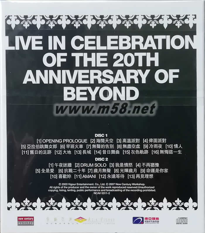 超越 03演唱會 BEYOND LIVE 03 CD(m58.net) 一別廿年,黃家強、黃貫中及葉世榮再次以Beyond的身份踏足舞臺,于4月30日起在香港紅館舉行一連五場Beyond成立20周年《BEYOND超越BEYOND LIVE 03演唱會》。是次演唱會最特別之處,乃Beyond三子花盡心思以投射影象方式讓逝世10周年的黃家駒重現(xiàn)舞臺,與歌迷一同懷念樂隊的主音靈魂人物,站在臺中間的家駒臺風(fēng)依舊,他手拿結(jié)他與三子合唱演唱會主題曲「抗戰(zhàn)二十年」,場面感人。 在《超越Beyond Live 03 - Since 1983》卡拉OK影碟中,大家在這遍「大地」看到Beyond出道廿年「舊日的足跡」及「昔日的舞曲」,亦在「冷雨夜」里「不再猶豫」;盡管家駒作了「無聲的告別」,一眾Beyond樂迷仍以「永遠(yuǎn)等待」的心情向你講聲「喜歡你」,Beyond! 由于樂迷的熱烈要求,Beyond欲罷不能,再于6月21至23日在紅館再次舉行第二回《Beyond超越Beyond Live 03 II》,他們便希望將演唱會中部分的款項贈給慈善機構(gòu)。