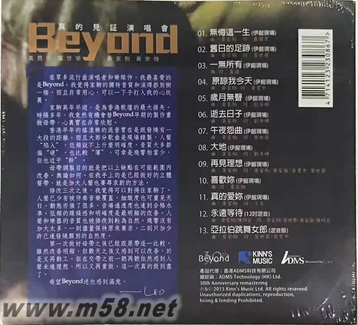 Beyond 89年香港真的見證演唱會 CD(m58.net) ADMS 特別輯錄”Beyond 89年香港真的見證演唱會”11首當時最熱斗歌曲,并加入從未出版的”永遠等待12”混合版”及”阿拉伯跳舞女郎混音版”, 并由Leo Fung重新作母盤調音, 以ADMS Alloy Gold 壓片, 是Beyond 歌迷不可或缺的珍藏品.
