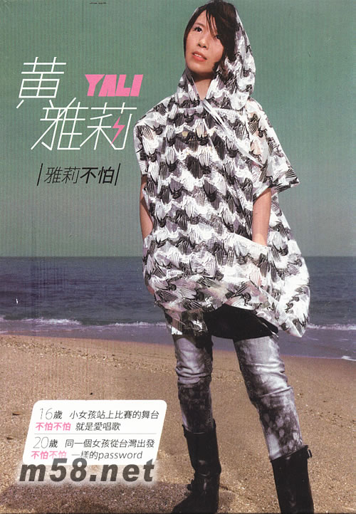 雅莉不怕(m58.net) 16歲 小女孩站上比賽的舞臺 不怕不怕 就是愛唱歌 20歲 同一個女孩從臺灣出發 不怕不怕 一樣password 黃雅莉/個人全新專輯『雅莉不怕』 誰是黃雅莉? 超女第二屆 湖南到北京 北京到臺北 雅莉不怕難 雅莉大聲唱 黃雅莉,1989年出生,湖南人2005年湖南衛視選秀節目「超級女聲」第2屆比賽出道,以16歲的年紀擠進超女 前六名,有強勢覆蓋整個大陸的媒體平臺推波助瀾,在湖南衛視旗下-天娛傳媒出過幾張合輯與單曲,代言過 幾個廣告,及多量的商業演出。 首波主打 戀愛絕句選 美式搖滾 雅莉不怕愛 嚴格制作 臺灣掛保證 睽違2年半,這一次黃雅莉的個人第二張新專輯『雅莉不怕』,2009年6月19在臺灣即將發行。首波主打「戀愛絕句選」這一首歌,是由陳學圣老師填詞,周顯哲老師作曲,是非常有意思的一首新歌。這一首旋律中帶有美式搖滾曲風,又表達現代後青春期小女孩,由20歲的女孩,黃雅莉,詮釋出在歌詞中調侃古代詩人的魯莽男女初戀情懷的中國風歌詞文字。專輯唯一的快歌主打。由黃雅莉唱出女生主動追男的勇氣,不怕失敗、積極求愛的代表作。
