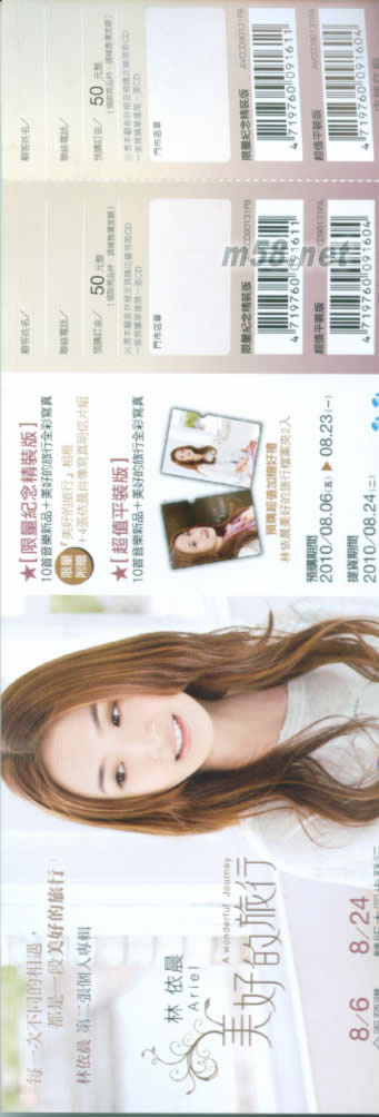 美好的旅行(臺灣預購限量紀念精裝版)(m58.net) 【限量紀念精裝版】 10首音樂新品+美好的旅行全彩寫真 限量附贈『美好的旅行』相框+4張依晨肖像寫真明信片組 每一次不同的相遇 都是一段美好的旅行 戲劇小天后林依晨 繼轉戰唱片首張個人專輯<幸福遇見> 首首主打 排行榜上屢創佳績! 第二張個人專輯 美好的旅行 遠赴倫敦拍攝專輯全新視覺 +首波主打「花一開就相愛吧」 2010.07.30全面預購 08.21雙版本同步發行
