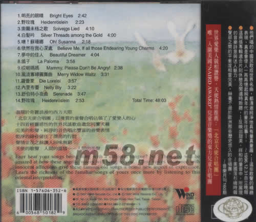 東方的天使之音 6 野玫瑰(m58.net) 純凈的和聲 漂亮的行腔 最精致細(xì)膩的民謠合唱專輯 如水般清澈的東方兒童和聲之美 他們唱的中國(guó)民歌或世界名曲,都清澈純凈地具有童真童趣,… 這些歌聲的精致表現(xiàn),真是會(huì)使人一再再憶起純真年代的童年往事…。~1996-12-31自立晚報(bào) 這兩張專輯適合片刻休息及閑適時(shí)聆聽,…反映出甜美、祥和的童音中,所展現(xiàn)的音樂(lè)詩(shī)意與迷人魅力。~美國(guó)落杉機(jī)時(shí)報(bào) 聲部之間的平衡度相當(dāng)完美,絲毫不遜于歐洲那些歷史悠久的合唱團(tuán)。~音樂(lè)月刑160期 世界愛樂(lè)人競(jìng)相贊譽(yù)。天使熱情推薦:[北京天使合唱團(tuán)]唯一入圍美國(guó)“NAIRD AWARD”兒童音樂(lè)獎(jiǎng)的東方兒童合唱團(tuán) 遨翔于奇麗浪漫的西方天際 [北京天使合唱團(tuán)]以優(yōu)質(zhì)的童聲合唱占領(lǐng)了了愛樂(lè)樂(lè)人的心 十四首輕靈感性的民界民謠歌曲邀您同響天籟 完美的和聲、純凈的音色唱出豐富的音樂(lè)表情 干凈的錄音留住了漂亮的行腔 聲情并茂之余讓人回味無(wú)窮 天使的歌聲 人間的溫情--人間的美聲 天使的心靈